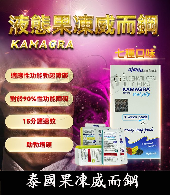 香港稱果凍偉哥、印度果凍偉哥,Kamagra Oral Jelly,有時候也叫泰國果凍偉哥,印度kamagra果凍威爾剛用於治療男性勃起功能障礙。印度kamagra果凍威而鋼是以凝膠形式製成的藥物,以適應那些吞咽片劑困難的人。 每盒Kamagra果凍威而鋼包含7袋不同口味的鳳梨,橙,草莓,香草,香蕉,黑醋栗和奶油。【商品規格】100mg*7包/盒
